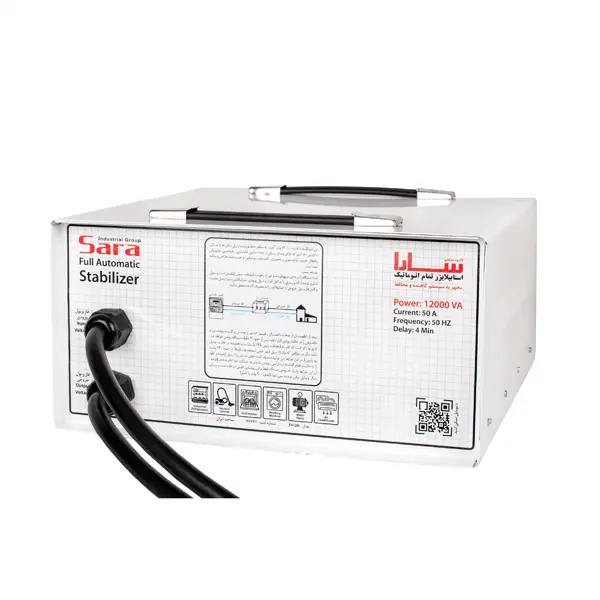 استابلایزر ۱۲۰۰۰ آمپر سارا، ترانس قدرتمند خانگی با عملکرد خودکار برای تثبیت و تقویت ولتاژ برق شهری و محافظت از وسایل برقی در برابر نوسانات، قطعی و افت برق.