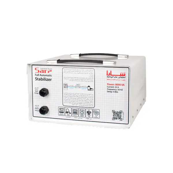 استابلایزر ۸۰۰۰ ولتآمپر سارا، ترانس پرتوان خانگی برای تثبیت و تقویت ولتاژ برق و محافظت از وسایل برقی در برابر نوسانات برق شهری. مناسب برای استفاده در کل منزل.